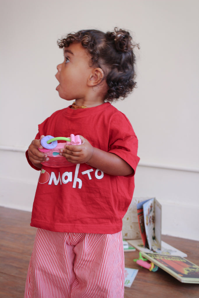 This extra-cute kids' tee features "tomayto tomahto" on a super-soft, pop of red, cotton tee.