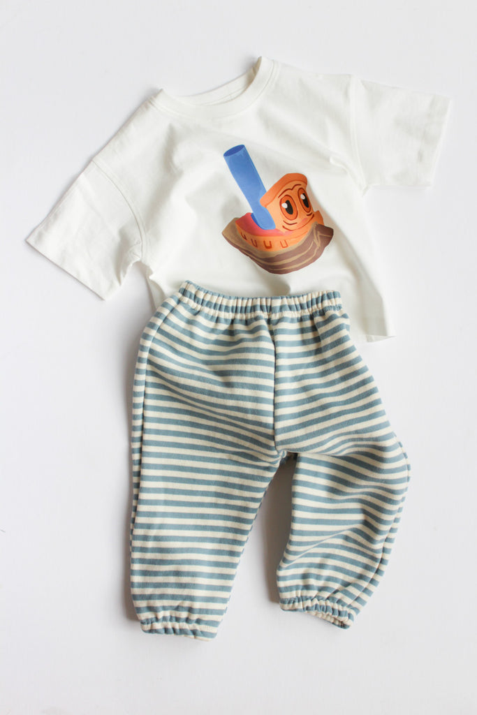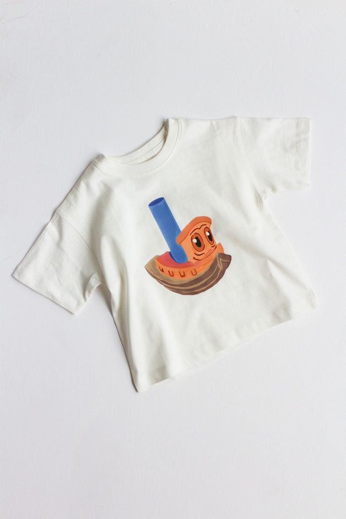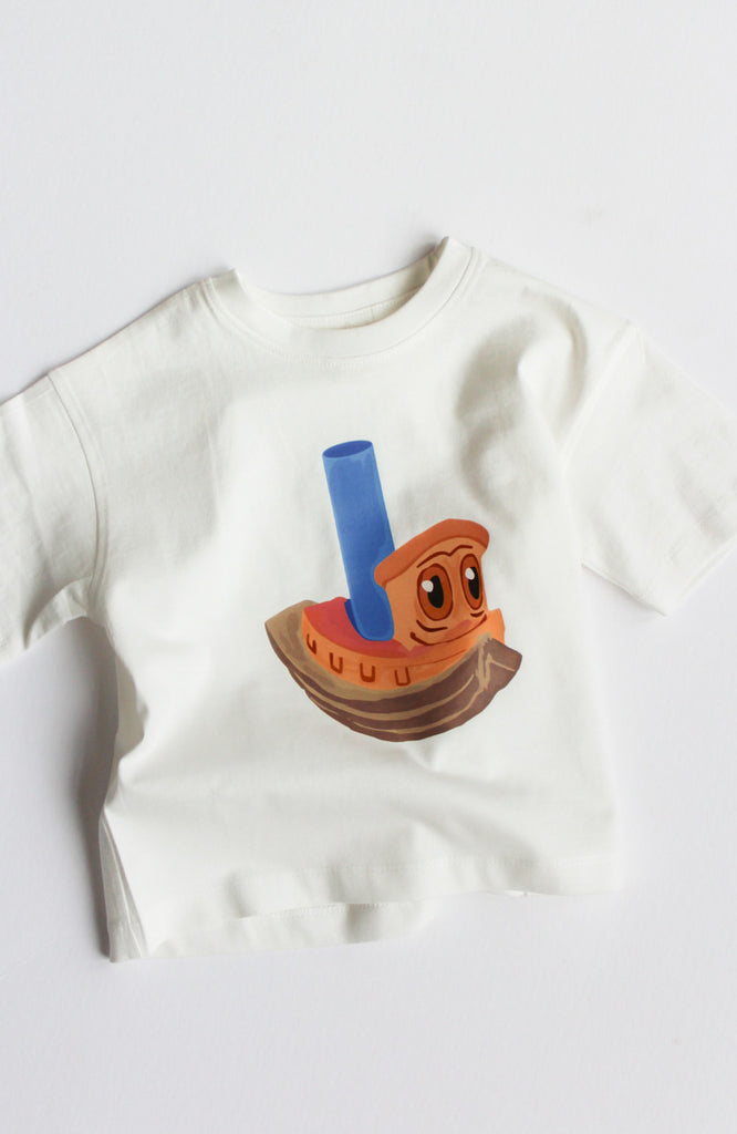 Colors: off-white tee with tugboat graphic