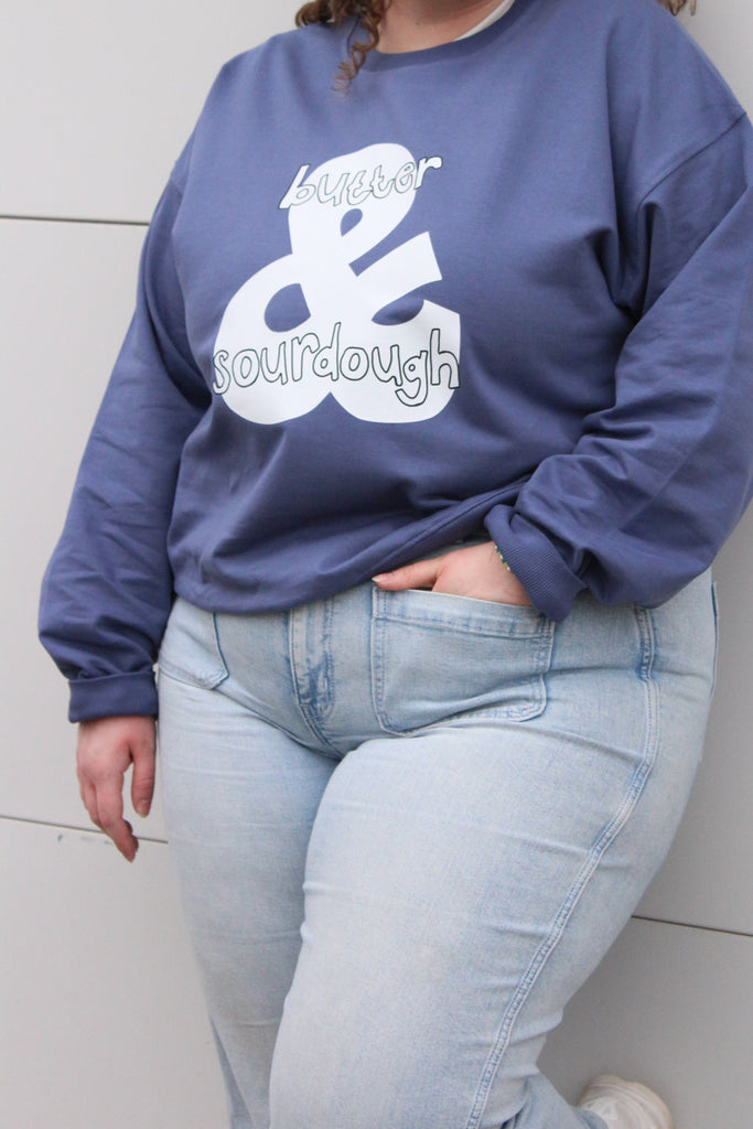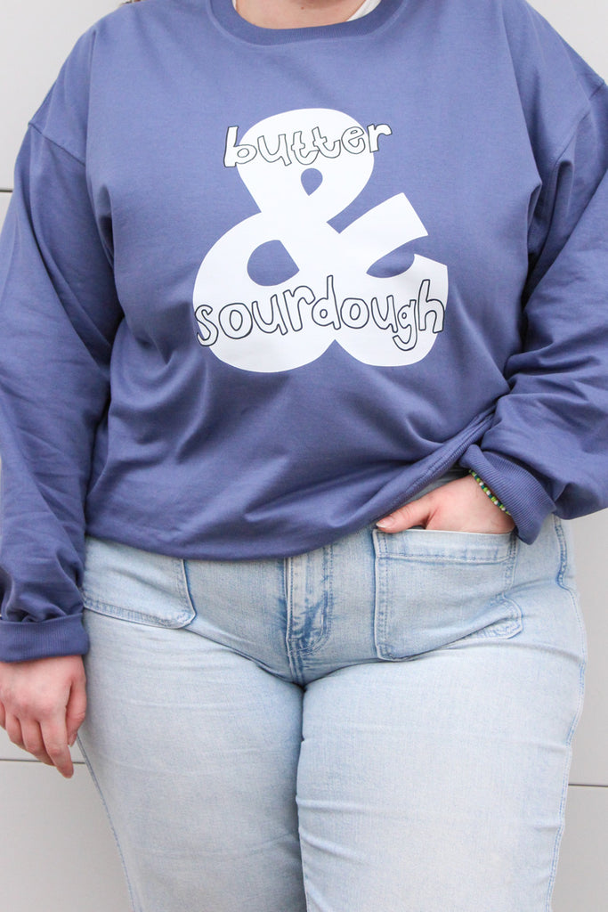Effortlessly cool, this easy blue pullover is the throw-on-and-go essential your closet’s been needing. Designed in a forever-classic crew silhouette with a perfectly slouchy drape, it’s finished with our playful butter + sourdough graphic for that sweet-meets-savory charm.