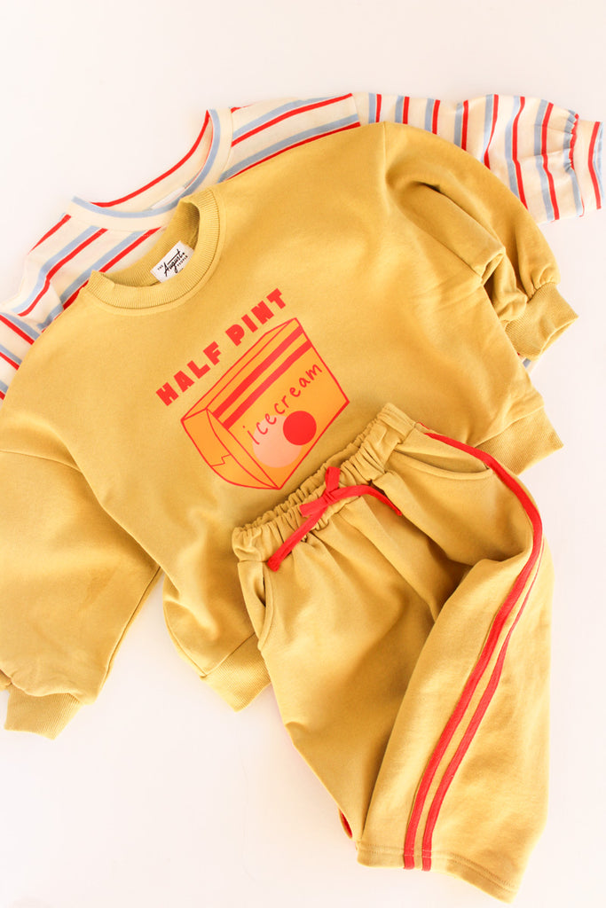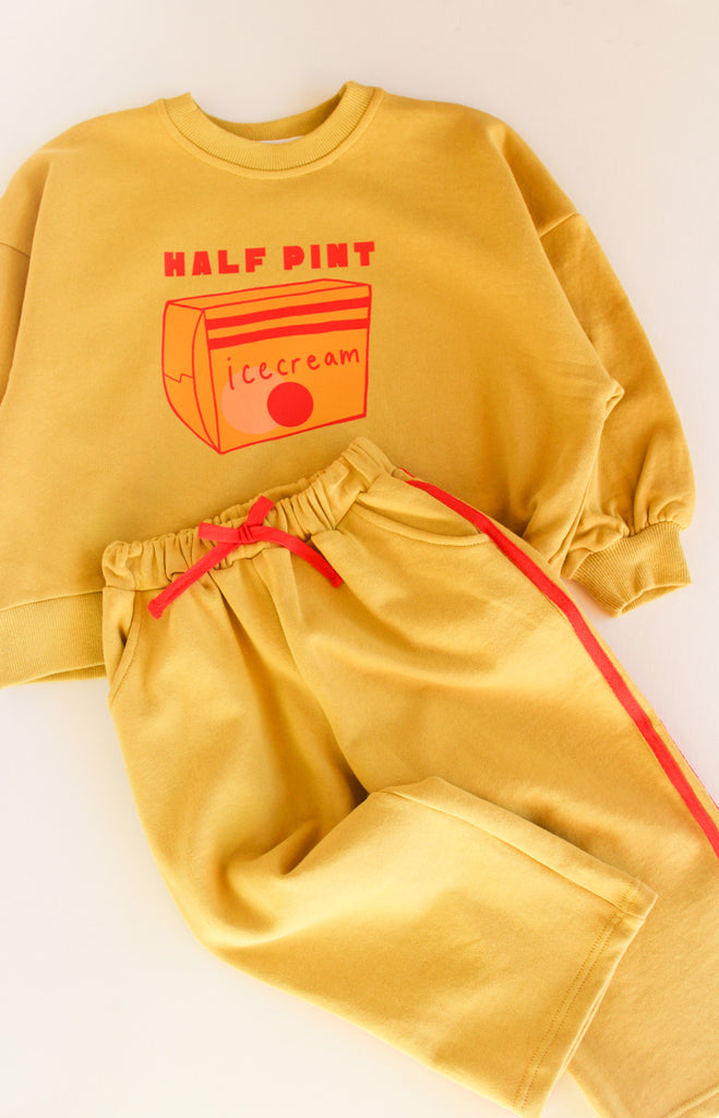 This extra-cute kids' crewneck features a half-pint ice cream graphic on a traditional crew-neck style. A nod to a beloved childhood read: the Little House on the Prairie series. "Half-Pint" was always a favorite nickname of mine that Pa used for Laura.