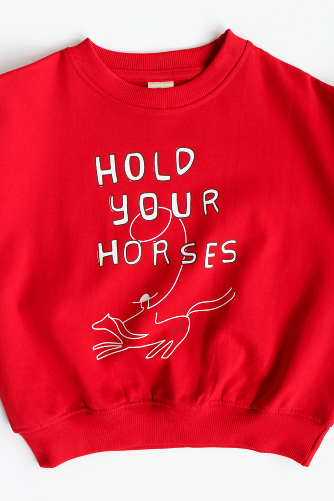 Laid-back and ready for whatever the day brings, this retro red sweatshirt is an easy favorite. Designed in a classic crew silhouette with a soft, relaxed feel, it features a playful “Hold Your Horses” graphic for just the right touch of big energy.
