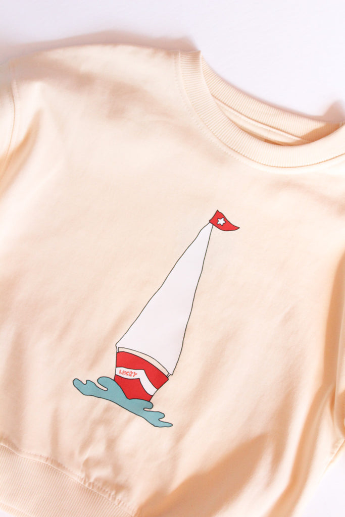Easy, timeless, and made for everyday - this vintage cream sweatshirt brings a little luck to their lineup. Designed in a classic crew silhouette with a relaxed, comfy fit, it features a red, blue, and white sailboat graphic with “Lucky” for a sweet, nostalgic touch.