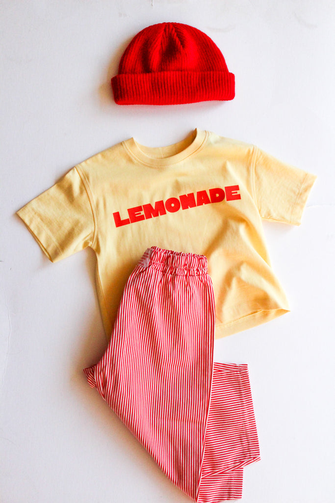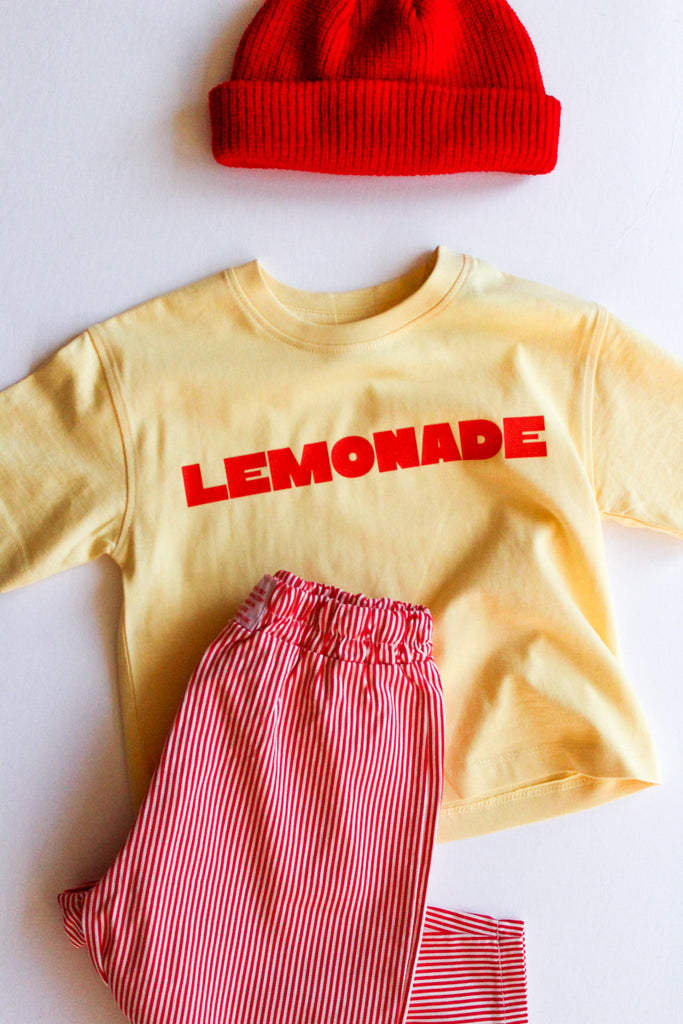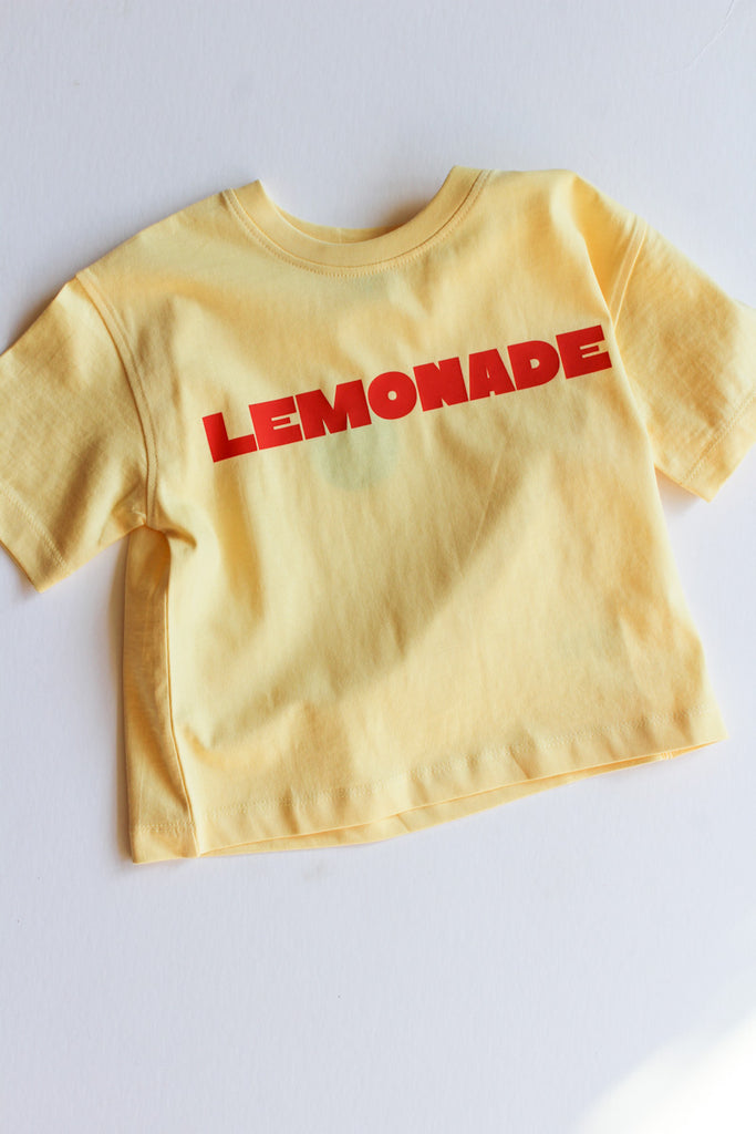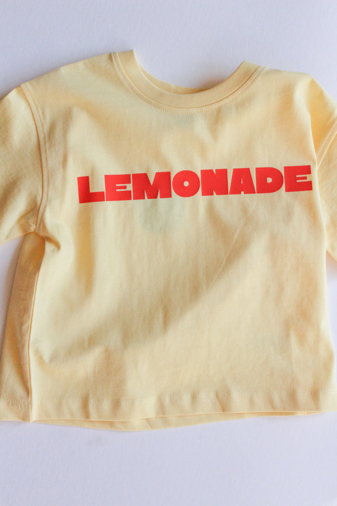 Color: butter yellow tee with orange/red lemonade graphic