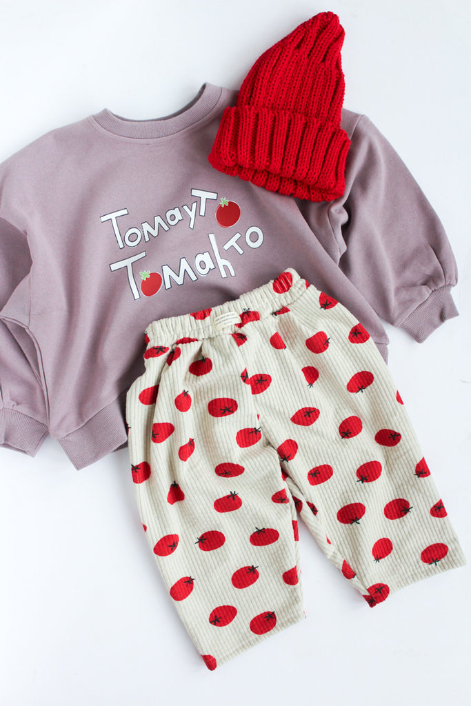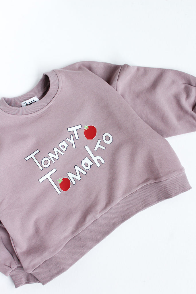 A playful kids' crewneck sweatshirt that celebrates the great "tomayto tomahto" debate. Pair with tomato trousers for an extra-cute outfit.