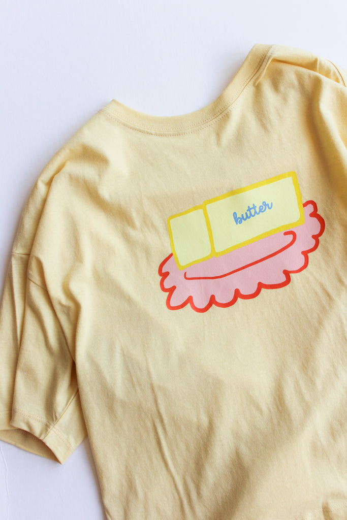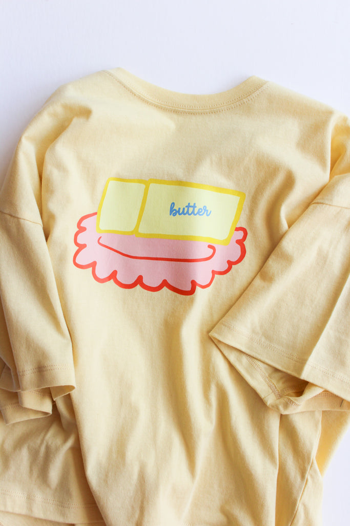 This easy going tee brings a laid back vibe with its soft cotton fabric and oversized fit, topped off our best selling butter dish design.
